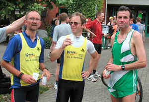 ...im Ziel und gut zufrieden: Uli Benke 45:29 min, Reinhard Woltering 44:40 min + Franz Bunthoff... die Ergebnisse 2002 vom Lauf... ...schöne Grüße auch an Bernhard Mathmann (links außen ;-)) |