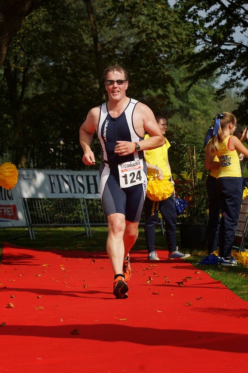 Bei Sprinttriathlon zählt Klaus van der Aa hier zu den Ausnahmen, weil er vom Wasserball kommt und deshalb auch als erster aus dem Wasser auf die Radstrecke ging. Hier mußte er dann nach und nach einige vorbeiziehen lassen, nur Manfred Fleige konnte ihn nicht einholen. Klaus wurde 32 von 52 Startern und Manfred belegte Platz 34.