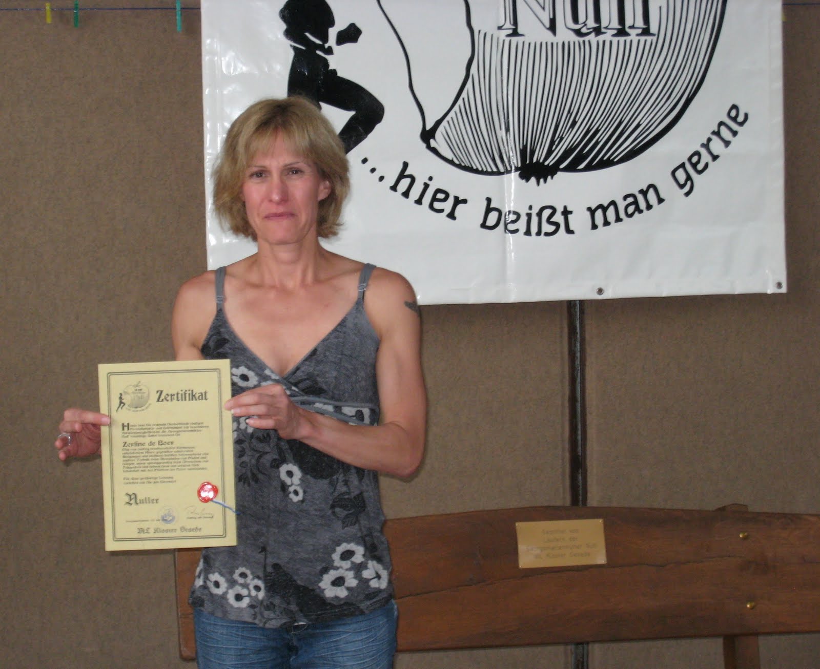 Der auch so genannte „Nuller“ startet in Georgsmarienhütte/Oesede und hat seinen Namen vom Wanderweg 0, der durch den Teuteburgerwald führt. In Zukunft wird dieser Wanderweg GMHütter Null heißen, was der Wanderverein jetzt genehmigt hat, als Resultat des Engagement des Veranstalters Georg P.F. Rollfing und Freunde, die jetzt auch verantwortlich sind für die Streckenmarkierung und – pflege. Durch den Kauf von Kilometern durch die Läufer kam das Geld für neue Markierungen schnell zusammen, das Anbringen ist schon fast abgeschlossen. Trotz der Markierungen kommt es immer noch vor, dass Läufer sich verirren. Klug ist es, wenn man sich einem „Berg – und Talläufer“ (gelbes Hemd für mind. 5 Teilnahmen) oder besser noch dem „Magister bergum et talum“ (rotes Hemd für mind. 10 Teilnahmen) anschließt, was Zerline de Boer (1. mal) und Heinrich Bäumer (3.mal) auch taten. Allein an diesem Tag musste Wilhelm Böing dreimal eine Läuferin zurückpfeifen, die sich von der Gruppe abgesetzt hatte und die Markierung der Abzweigung übersah. Besonders erwähnenswert ist das gemeinsame Frühstück vor dem Lauf und die Geselligkeit beim Essen und Trinken nach dem Lauf. Der GMHütter Null wird im Juli und Dezember angeboten. www.rollfing.de